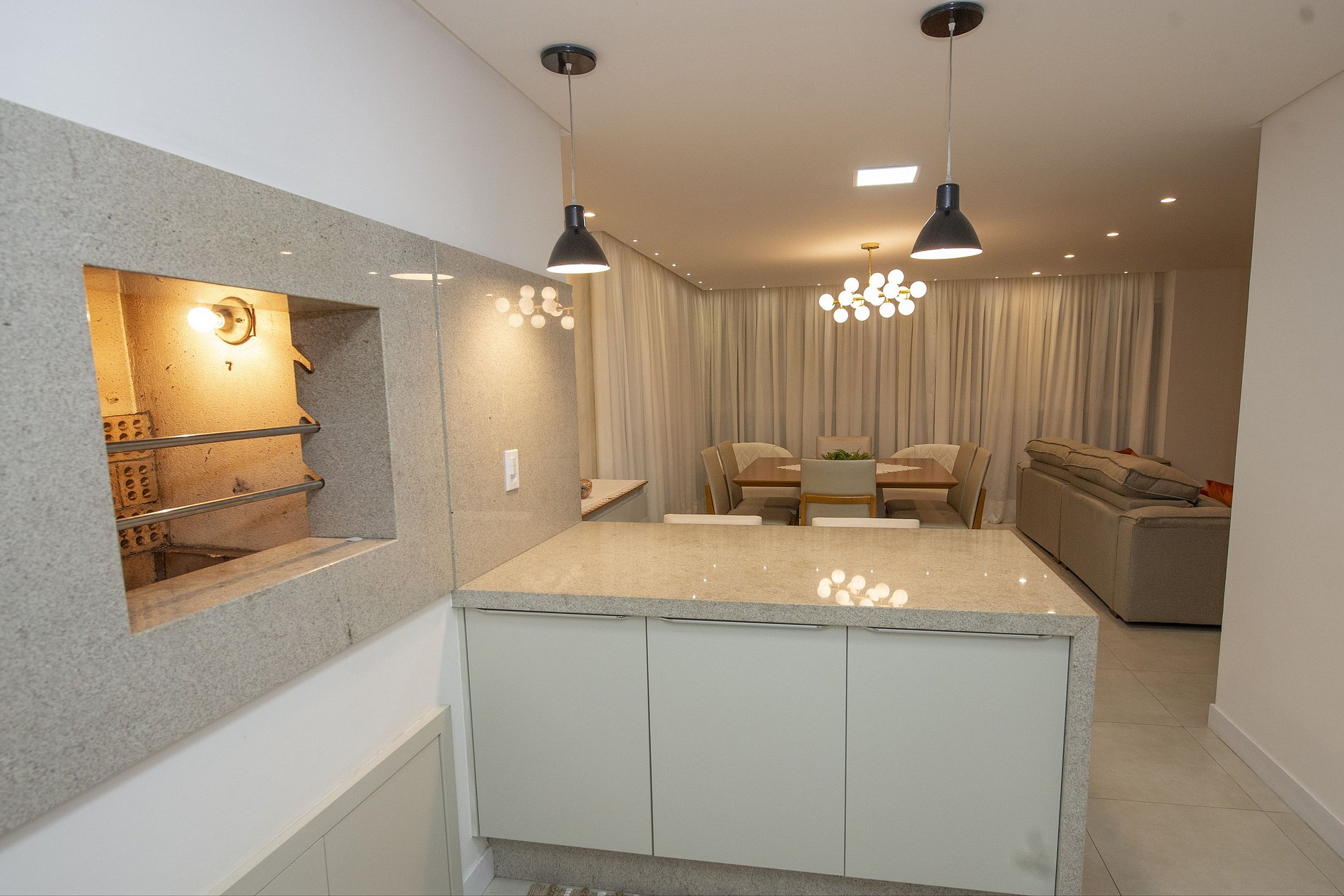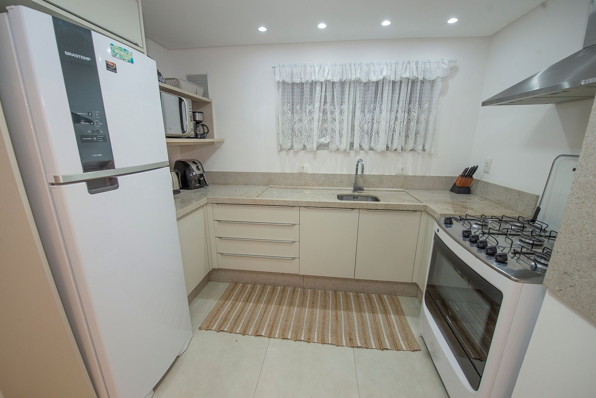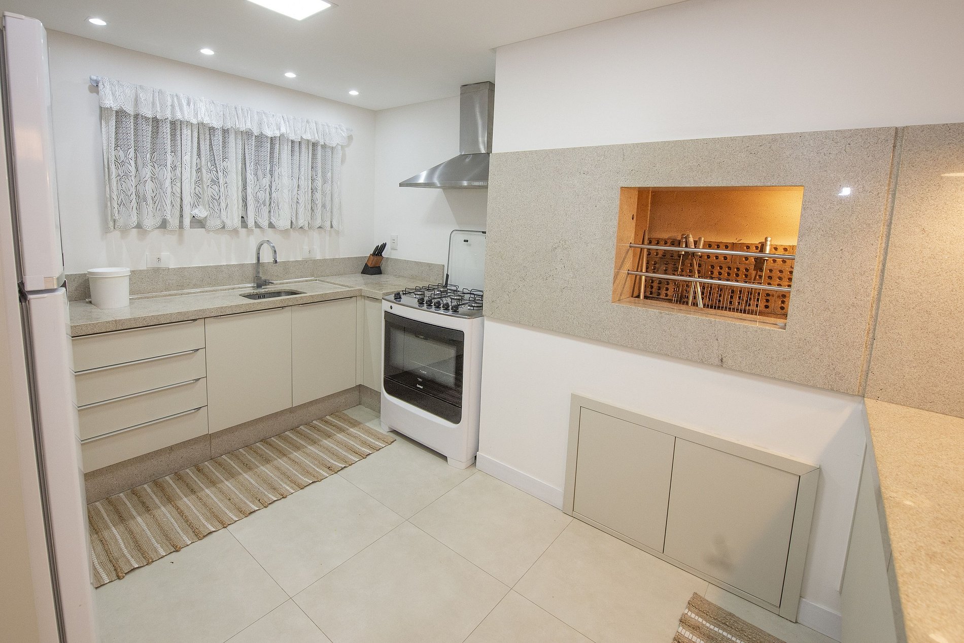 Cozinha conta com churrasqueira interna com exaustão por acionamento eletrônico, liquidificador, cafeteira e todos os utensílios para o preparo de suas refeições.