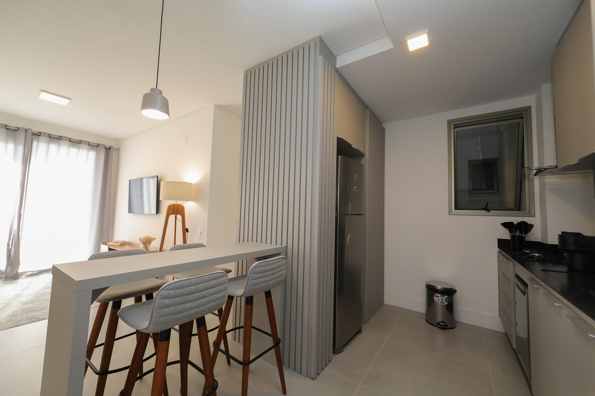 Com uma Suíte mais um Dormitório, Banheiro social e Sala de Estar integrada à Cozinha de forma inteligente.