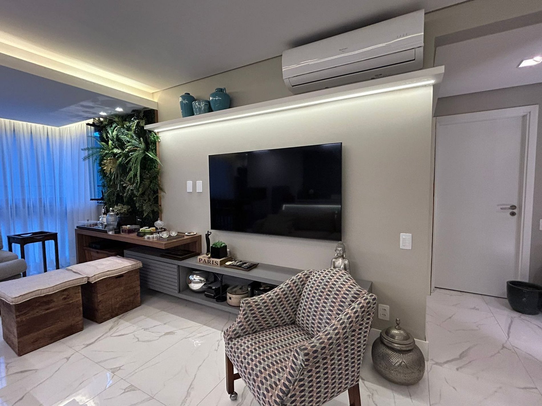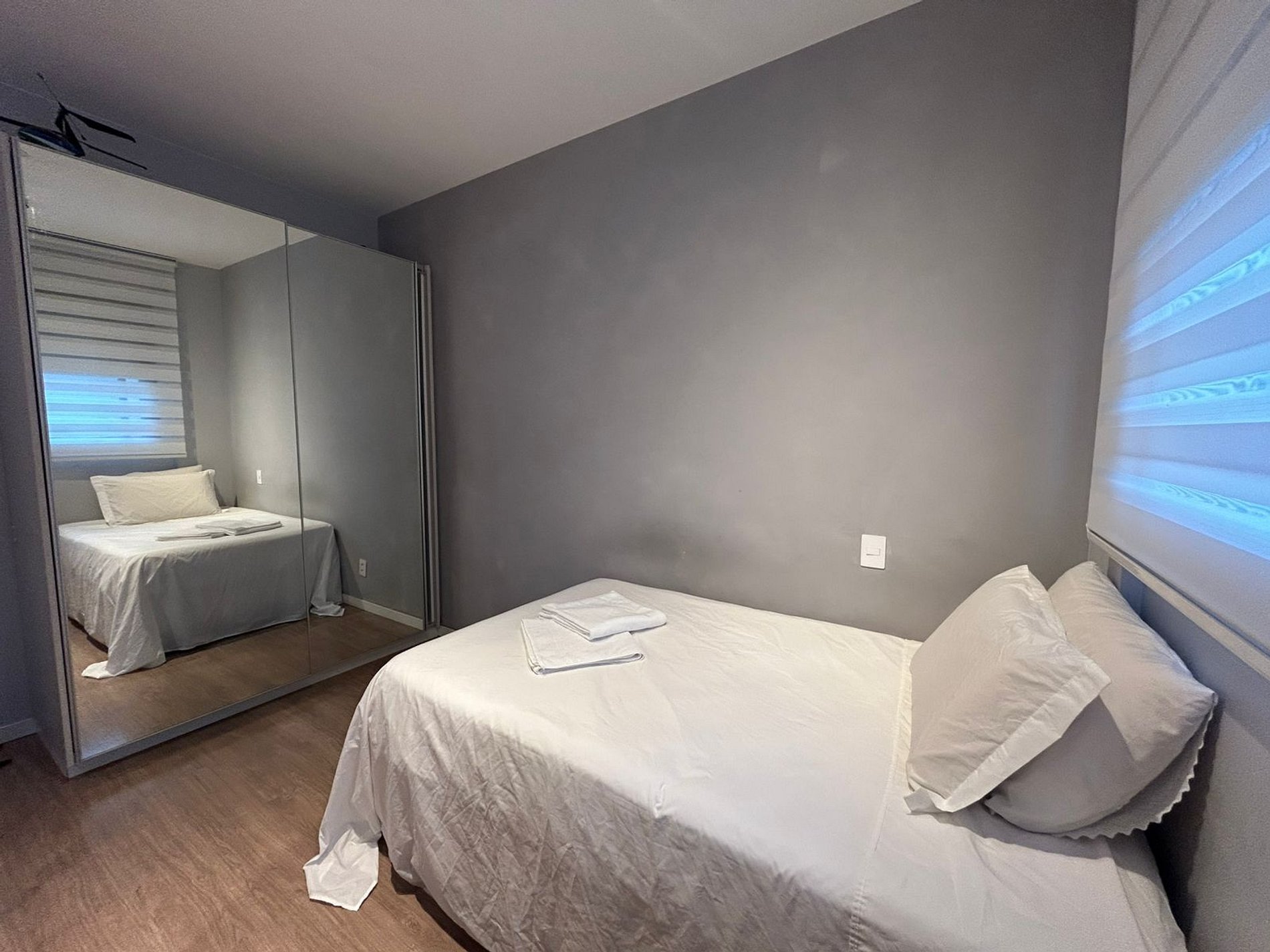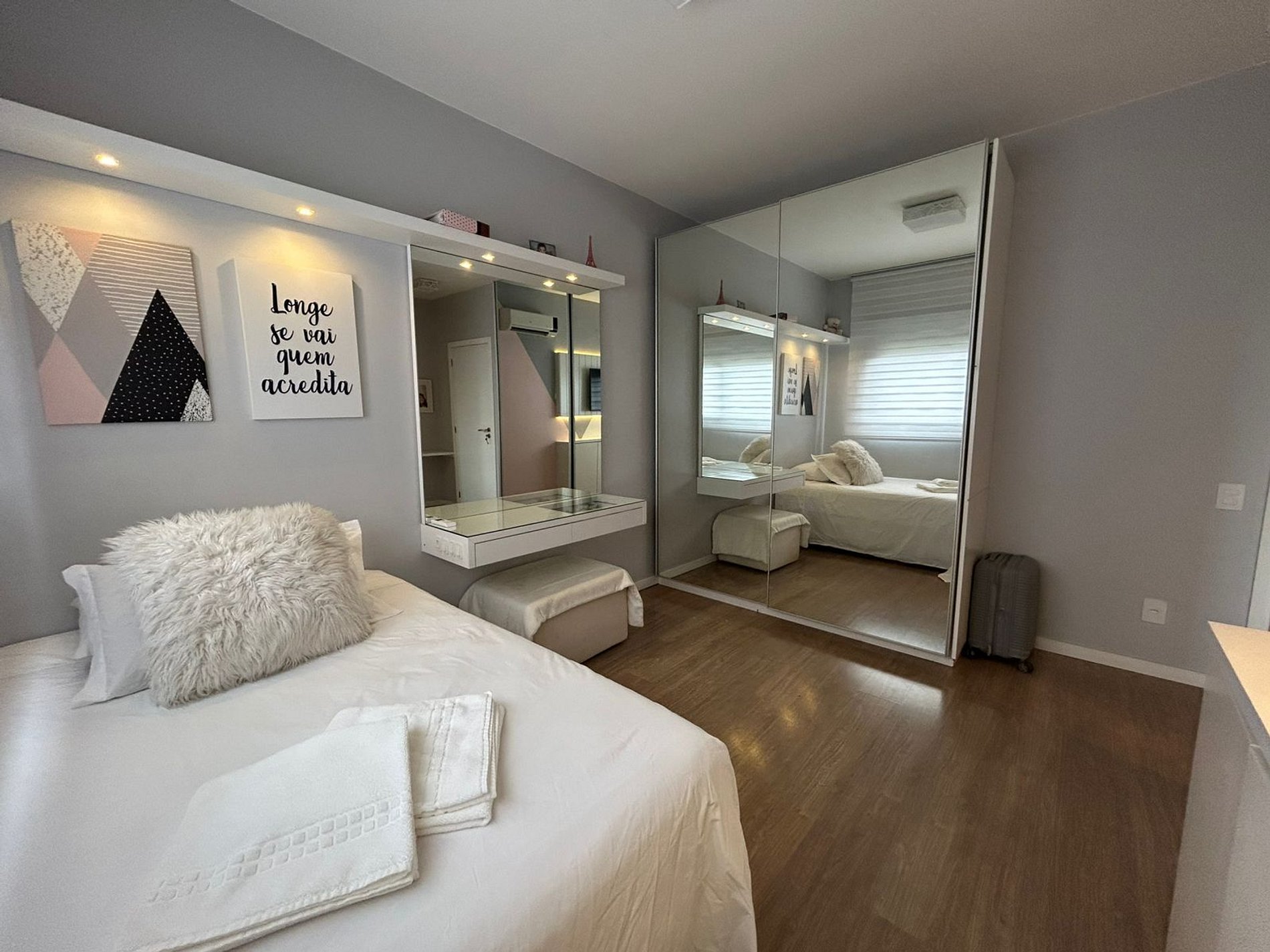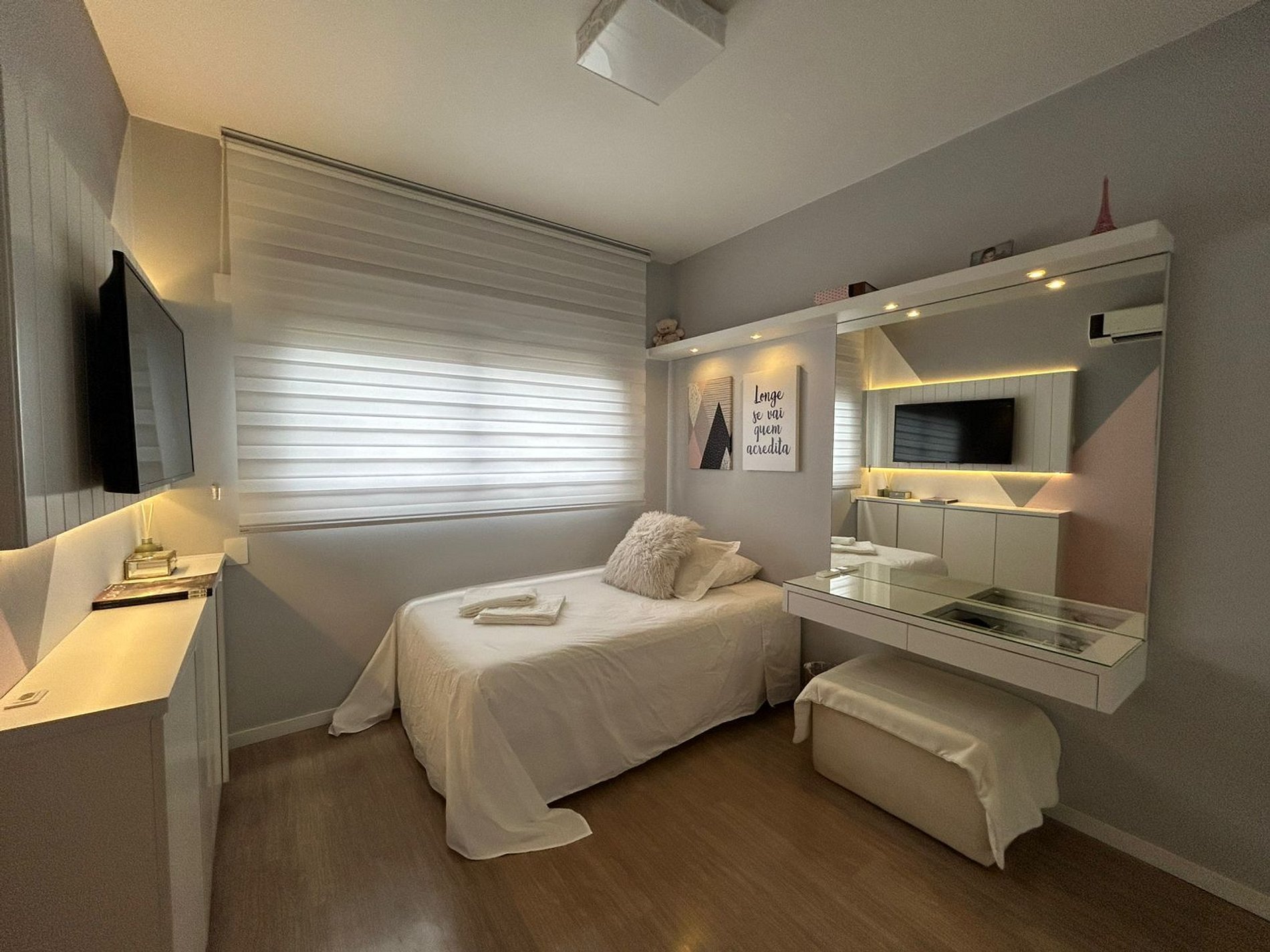 Apartamento com TV e Ar Condicionado na Sala e nas 2 Suítes, Churrasqueira, Lava louças, Máq. Lava e Seca, Equipamentos de cozinha, Bar e Cafeteira.